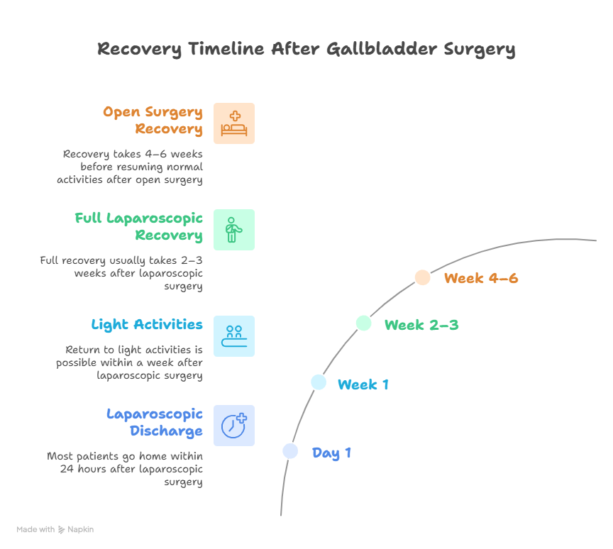 - Laparoscopic Surgery: Most patients can go home within 24 hours and return to light activities within a week. Full recovery usually takes 2–3 weeks.